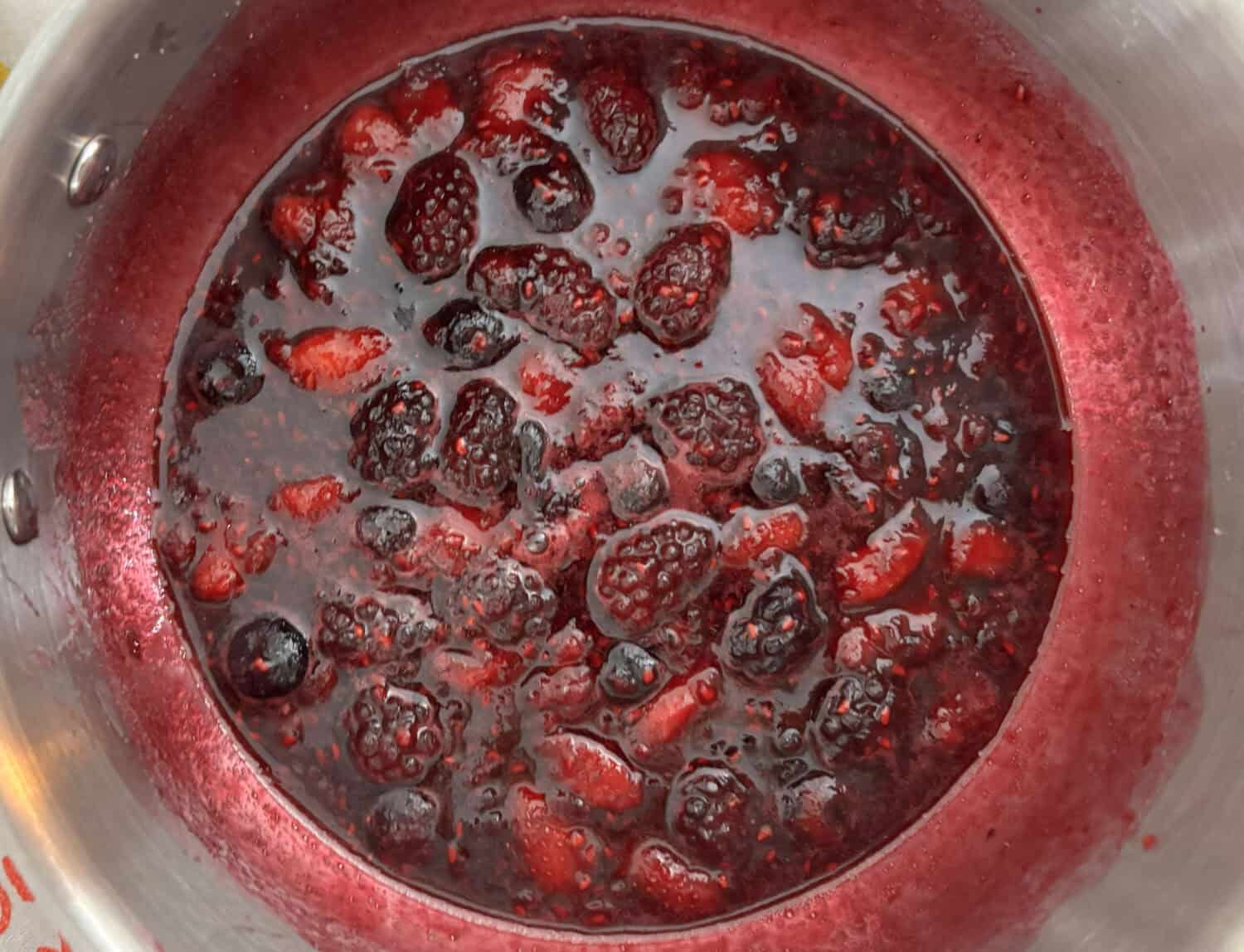 - In a sauce pan, over medium-high heat, place the frozen berries, cutting up the strawberries into small chunks and add the sugar and dash of salt.